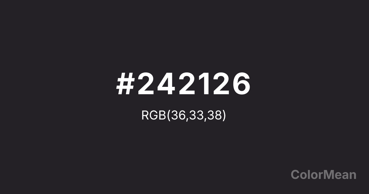 #242126 RGB value is (36, 33, 38). The hex color red value is 36, green is 33, and blue is 38. Its HSL format shows a hue of 276°, saturation of 7 percent, and lightness of 14 percent. The CMYK process values are 5 percent, 13 percent, 0 percent, 85 percent.