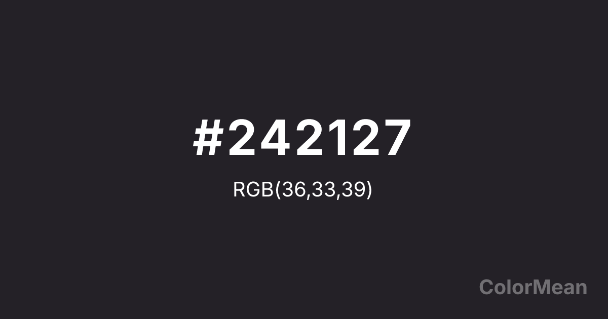 #242127 RGB value is (36, 33, 39). The hex color red value is 36, green is 33, and blue is 39. Its HSL format shows a hue of 270°, saturation of 8 percent, and lightness of 14 percent. The CMYK process values are 8 percent, 15 percent, 0 percent, 85 percent.