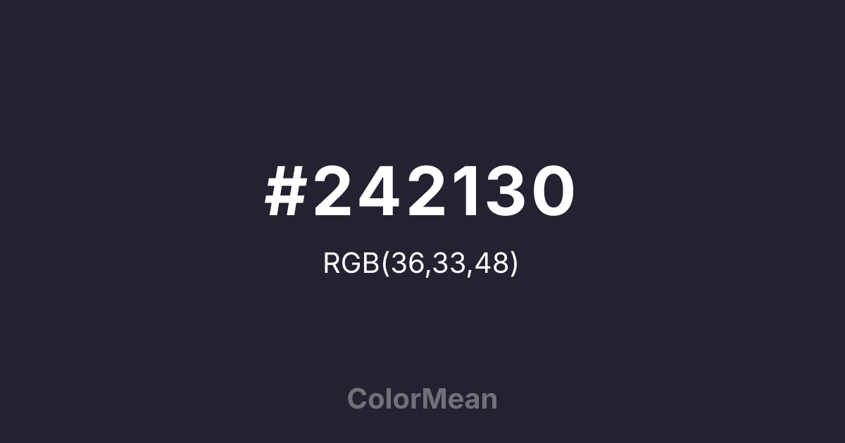 #242130 RGB value is (36, 33, 48). The hex color red value is 36, green is 33, and blue is 48. Its HSL format shows a hue of 252°, saturation of 19 percent, and lightness of 16 percent. The CMYK process values are 25 percent, 31 percent, 0 percent, 81 percent.