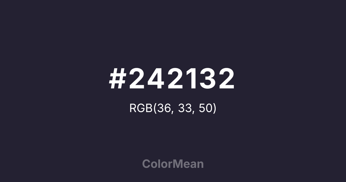 #242132 RGB value is (36, 33, 50). The hex color red value is 36, green is 33, and blue is 50. Its HSL format shows a hue of 251°, saturation of 20 percent, and lightness of 16 percent. The CMYK process values are 28 percent, 34 percent, 0 percent, 80 percent.