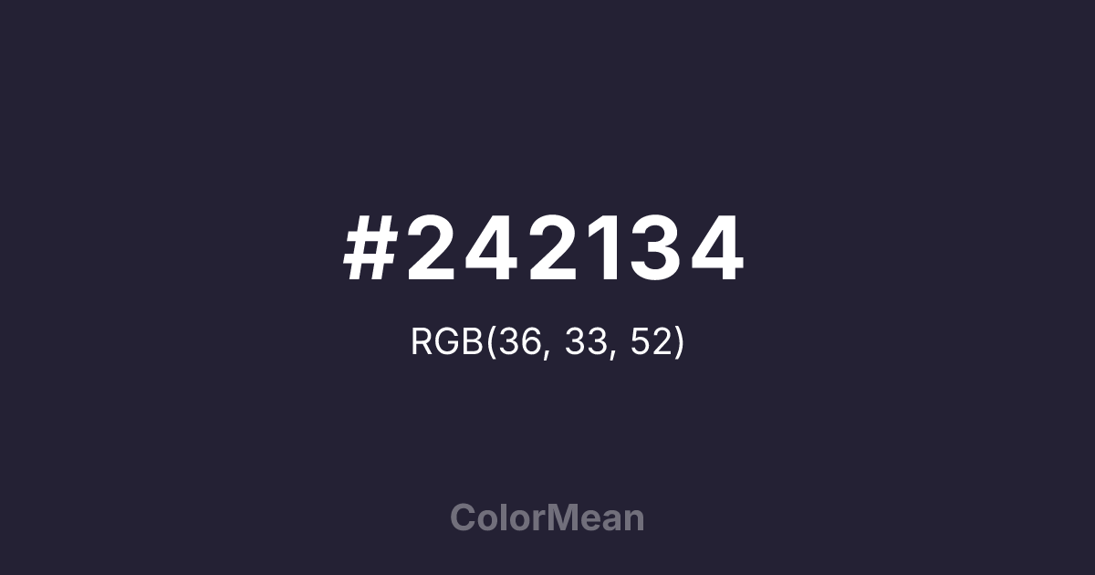 #242134 RGB value is (36, 33, 52). The hex color red value is 36, green is 33, and blue is 52. Its HSL format shows a hue of 249°, saturation of 22 percent, and lightness of 17 percent. The CMYK process values are 31 percent, 37 percent, 0 percent, 80 percent.