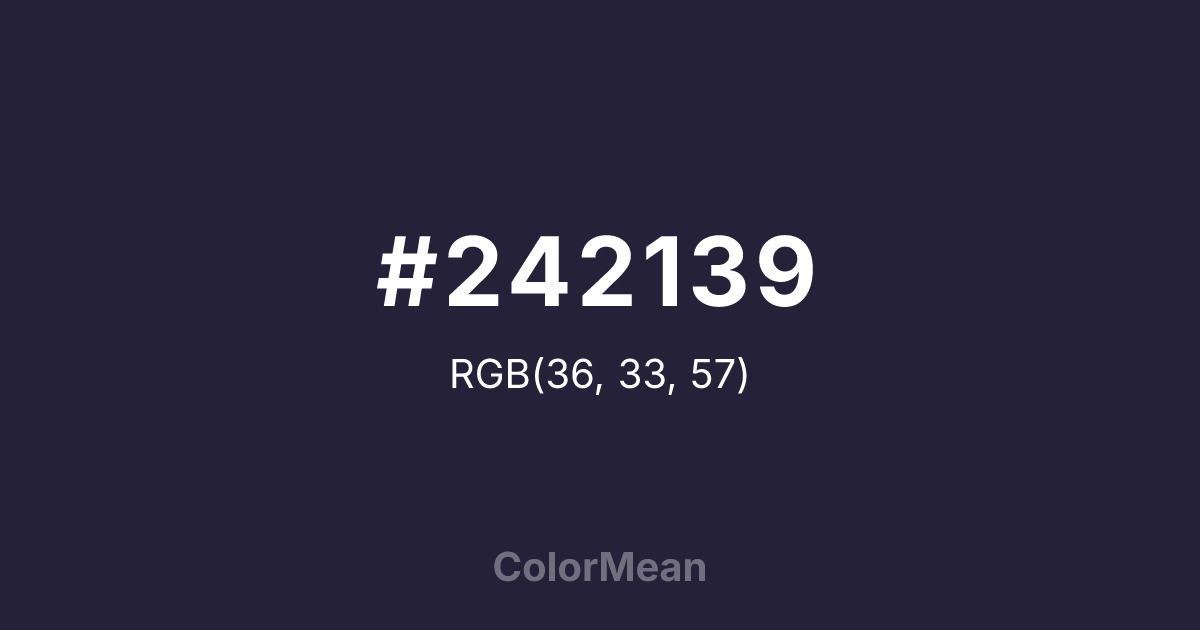 #242139 RGB value is (36, 33, 57). The hex color red value is 36, green is 33, and blue is 57. Its HSL format shows a hue of 248°, saturation of 27 percent, and lightness of 18 percent. The CMYK process values are 37 percent, 42 percent, 0 percent, 78 percent.
