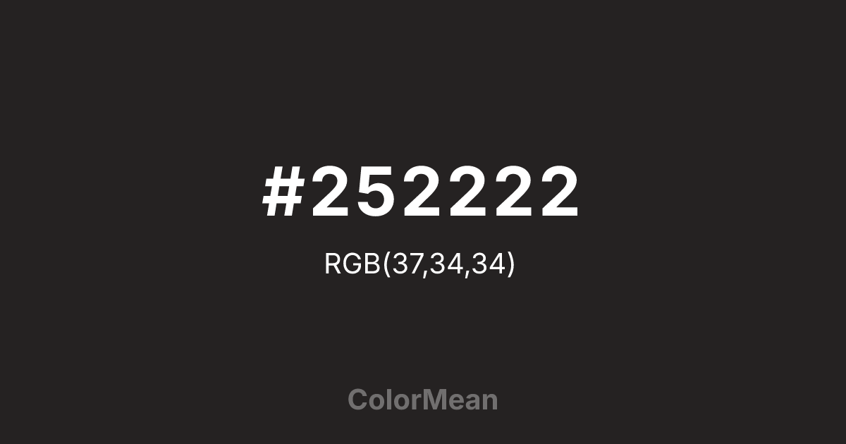 #252222 RGB value is (37, 34, 34). The hex color red value is 37, green is 34, and blue is 34. Its HSL format shows a hue of 0°, saturation of 4 percent, and lightness of 14 percent. The CMYK process values are 0 percent, 8 percent, 8 percent, 85 percent.