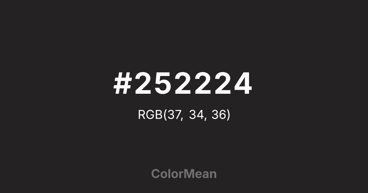 #252224 RGB value is (37, 34, 36). The hex color red value is 37, green is 34, and blue is 36. Its HSL format shows a hue of 320°, saturation of 4 percent, and lightness of 14 percent. The CMYK process values are 0 percent, 8 percent, 3 percent, 85 percent.