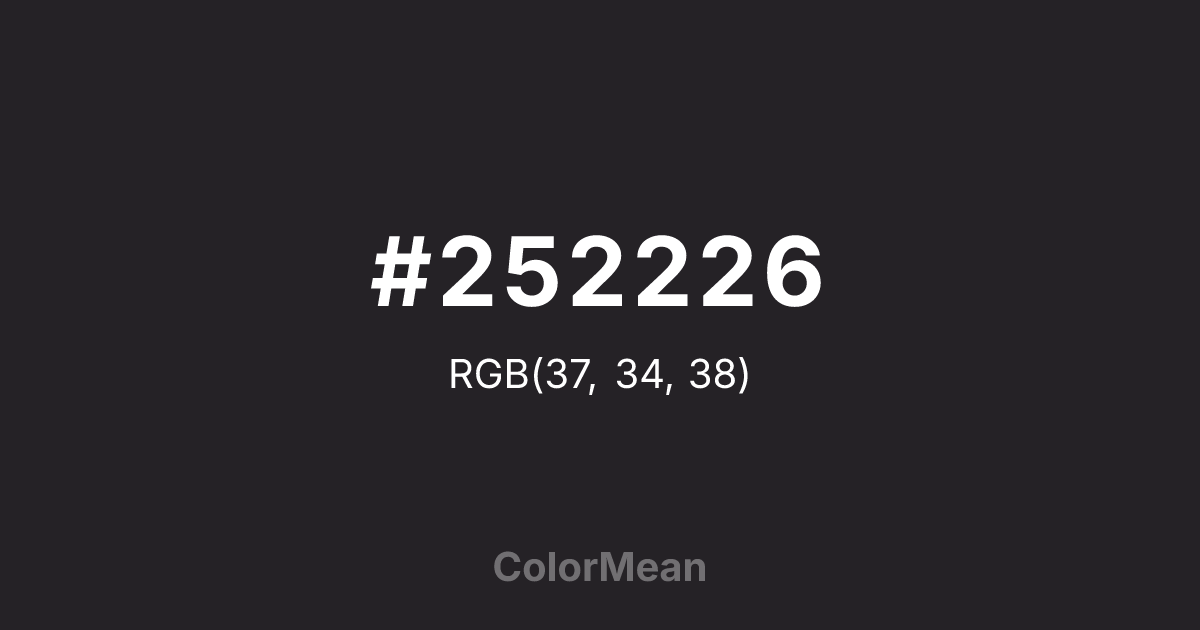 #252226 RGB value is (37, 34, 38). The hex color red value is 37, green is 34, and blue is 38. Its HSL format shows a hue of 285°, saturation of 6 percent, and lightness of 14 percent. The CMYK process values are 3 percent, 11 percent, 0 percent, 85 percent.