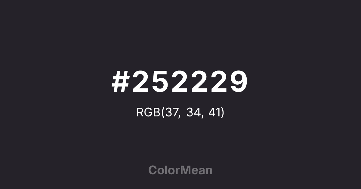 #252229 RGB value is (37, 34, 41). The hex color red value is 37, green is 34, and blue is 41. Its HSL format shows a hue of 266°, saturation of 9 percent, and lightness of 15 percent. The CMYK process values are 10 percent, 17 percent, 0 percent, 84 percent.
