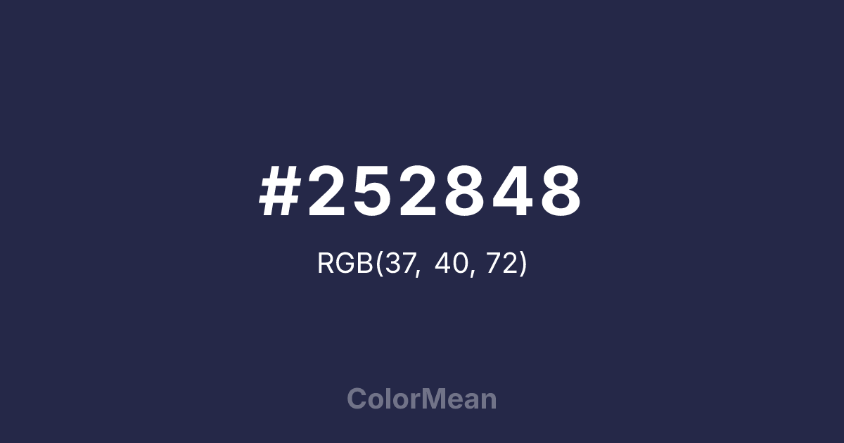 #252848 RGB value is (37, 40, 72). The hex color red value is 37, green is 40, and blue is 72. Its HSL format shows a hue of 235°, saturation of 32 percent, and lightness of 21 percent. The CMYK process values are 49 percent, 44 percent, 0 percent, 72 percent.