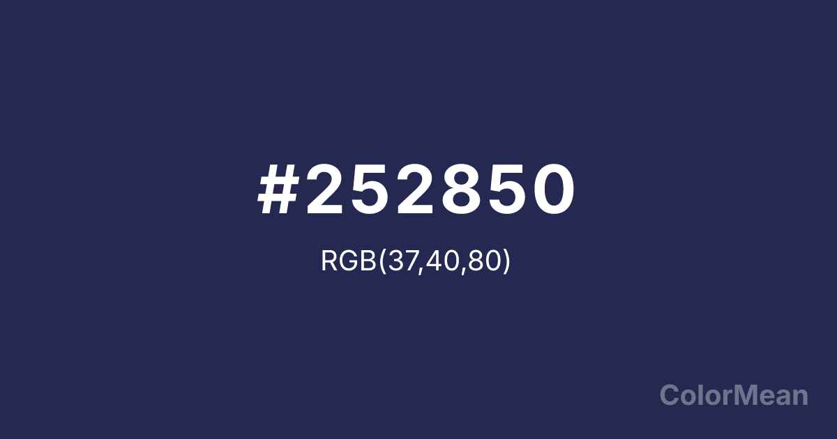 Night Blue (#252850) RGB value is (37, 40, 80). The hex color red value is 37, green is 40, and blue is 80. Its HSL format shows a hue of 236°, saturation of 37 percent, and lightness of 23 percent. The CMYK process values are 54 percent, 50 percent, 0 percent, 69 percent.