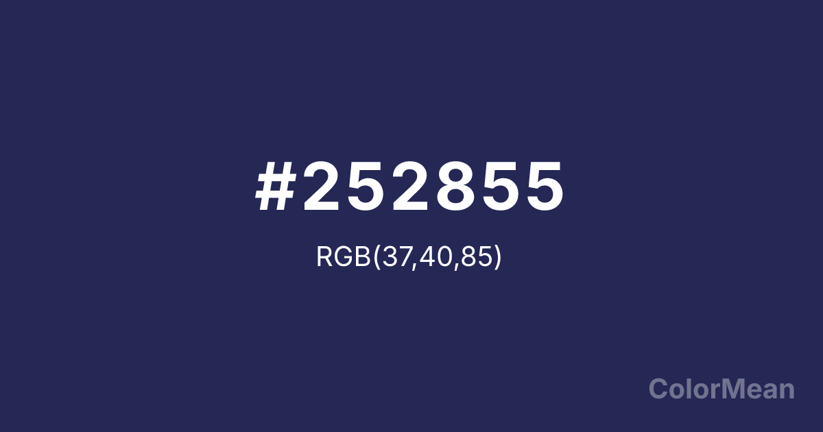#252855 RGB value is (37, 40, 85). The hex color red value is 37, green is 40, and blue is 85. Its HSL format shows a hue of 236°, saturation of 39 percent, and lightness of 24 percent. The CMYK process values are 56 percent, 53 percent, 0 percent, 67 percent.