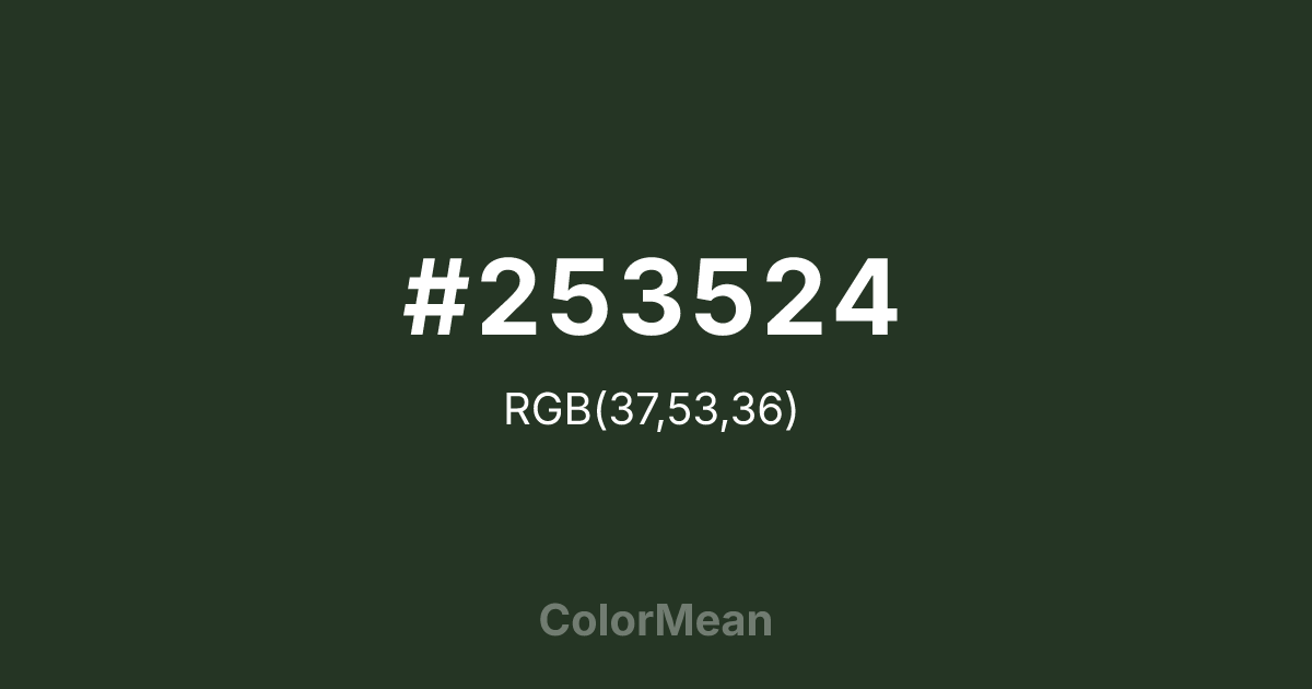 #253524 RGB value is (37, 53, 36). The hex color red value is 37, green is 53, and blue is 36. Its HSL format shows a hue of 116°, saturation of 19 percent, and lightness of 17 percent. The CMYK process values are 30 percent, 0 percent, 32 percent, 79 percent.