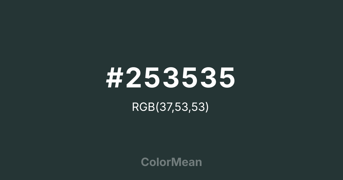 #253535 RGB value is (37, 53, 53). The hex color red value is 37, green is 53, and blue is 53. Its HSL format shows a hue of 180°, saturation of 18 percent, and lightness of 18 percent. The CMYK process values are 30 percent, 0 percent, 0 percent, 79 percent.