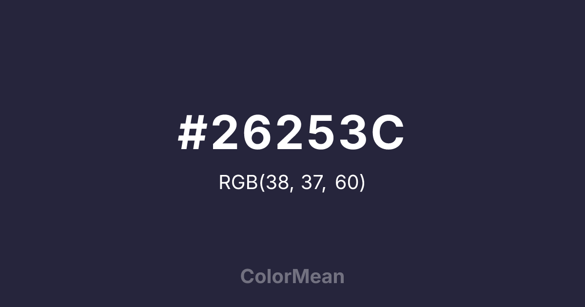 #26253C RGB value is (38, 37, 60). The hex color red value is 38, green is 37, and blue is 60. Its HSL format shows a hue of 243°, saturation of 24 percent, and lightness of 19 percent. The CMYK process values are 37 percent, 38 percent, 0 percent, 76 percent.