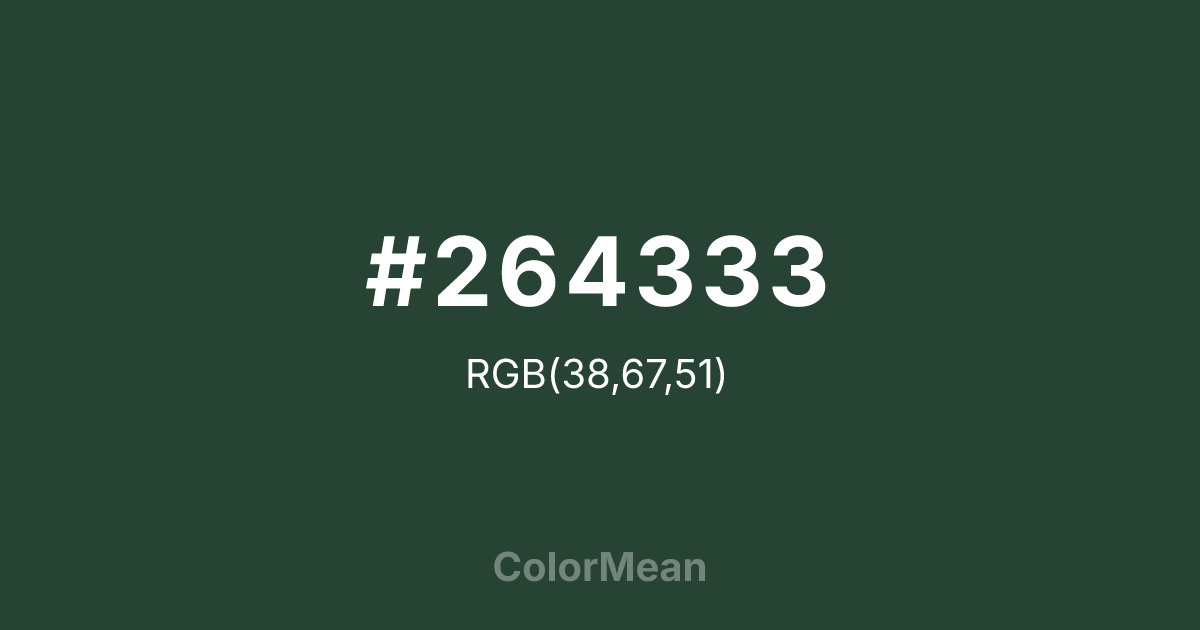 #264333 RGB value is (38, 67, 51). The hex color red value is 38, green is 67, and blue is 51. Its HSL format shows a hue of 147°, saturation of 28 percent, and lightness of 21 percent. The CMYK process values are 43 percent, 0 percent, 24 percent, 74 percent.