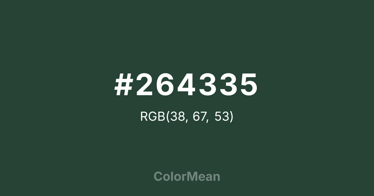 #264335 RGB value is (38, 67, 53). The hex color red value is 38, green is 67, and blue is 53. Its HSL format shows a hue of 151°, saturation of 28 percent, and lightness of 21 percent. The CMYK process values are 43 percent, 0 percent, 21 percent, 74 percent.