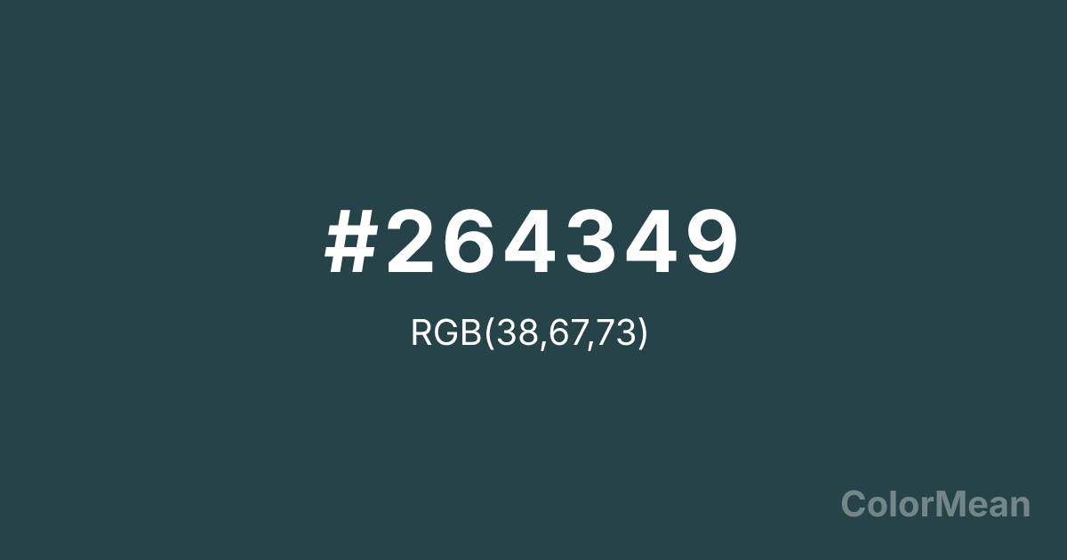 #264349 RGB value is (38, 67, 73). The hex color red value is 38, green is 67, and blue is 73. Its HSL format shows a hue of 190°, saturation of 32 percent, and lightness of 22 percent. The CMYK process values are 48 percent, 8 percent, 0 percent, 71 percent.
