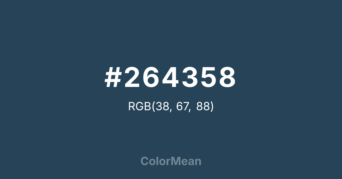 #264358 RGB value is (38, 67, 88). The hex color red value is 38, green is 67, and blue is 88. Its HSL format shows a hue of 205°, saturation of 40 percent, and lightness of 25 percent. The CMYK process values are 57 percent, 24 percent, 0 percent, 65 percent.