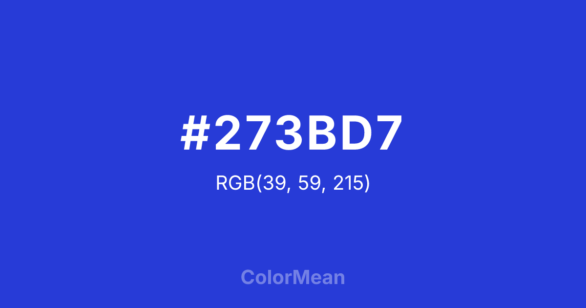 #273BD7 RGB value is (39, 59, 215). The hex color red value is 39, green is 59, and blue is 215. Its HSL format shows a hue of 233°, saturation of 69 percent, and lightness of 50 percent. The CMYK process values are 82 percent, 73 percent, 0 percent, 16 percent.