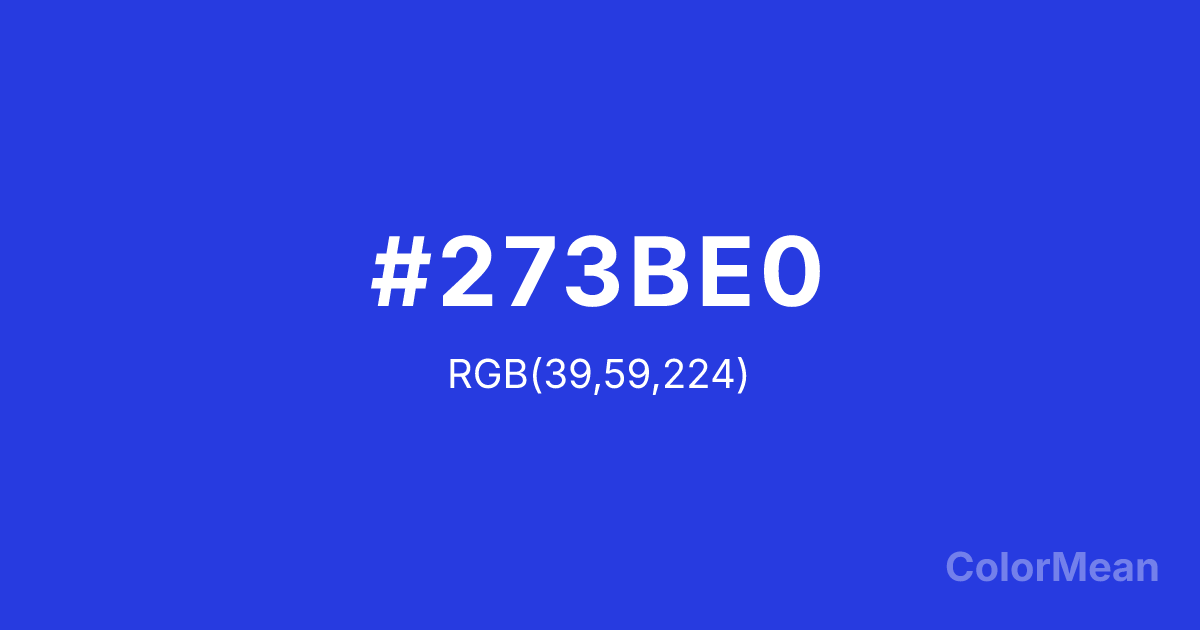 #273BE0 RGB value is (39, 59, 224). The hex color red value is 39, green is 59, and blue is 224. Its HSL format shows a hue of 234°, saturation of 75 percent, and lightness of 52 percent. The CMYK process values are 83 percent, 74 percent, 0 percent, 12 percent.