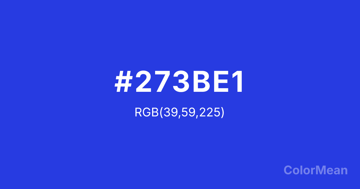 #273BE1 RGB value is (39, 59, 225). The hex color red value is 39, green is 59, and blue is 225. Its HSL format shows a hue of 234°, saturation of 76 percent, and lightness of 52 percent. The CMYK process values are 83 percent, 74 percent, 0 percent, 12 percent.
