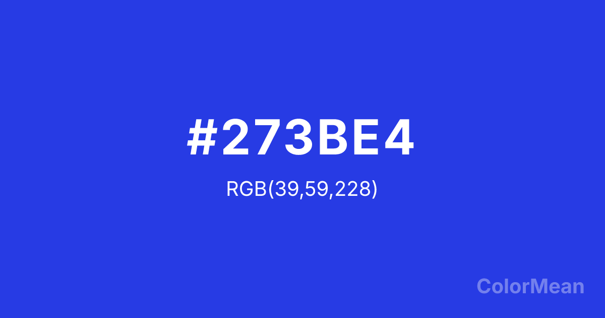 #273BE4 RGB value is (39, 59, 228). The hex color red value is 39, green is 59, and blue is 228. Its HSL format shows a hue of 234°, saturation of 78 percent, and lightness of 52 percent. The CMYK process values are 83 percent, 74 percent, 0 percent, 11 percent.