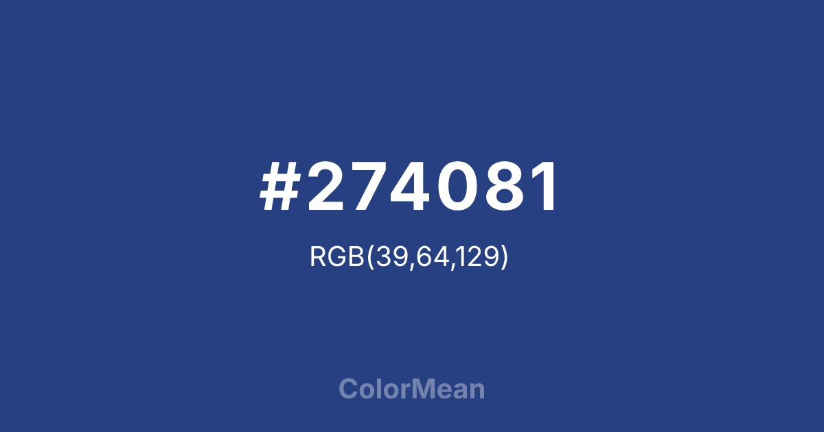 #274081 RGB value is (39, 64, 129). The hex color red value is 39, green is 64, and blue is 129. Its HSL format shows a hue of 223°, saturation of 54 percent, and lightness of 33 percent. The CMYK process values are 70 percent, 50 percent, 0 percent, 49 percent.
