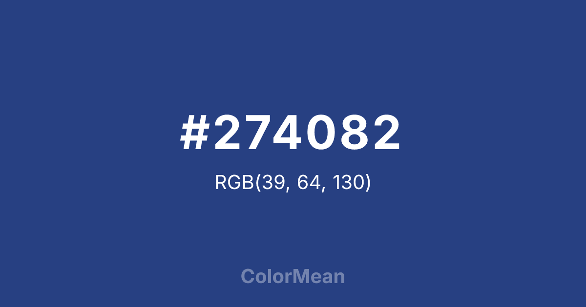 #274082 RGB value is (39, 64, 130). The hex color red value is 39, green is 64, and blue is 130. Its HSL format shows a hue of 224°, saturation of 54 percent, and lightness of 33 percent. The CMYK process values are 70 percent, 51 percent, 0 percent, 49 percent.