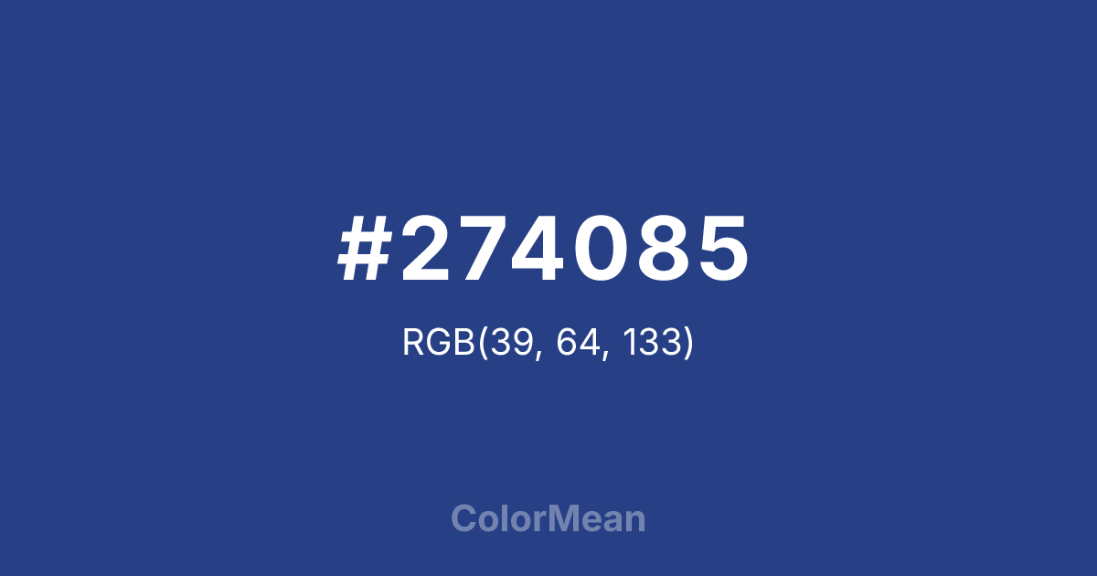 #274085 RGB value is (39, 64, 133). The hex color red value is 39, green is 64, and blue is 133. Its HSL format shows a hue of 224°, saturation of 55 percent, and lightness of 34 percent. The CMYK process values are 71 percent, 52 percent, 0 percent, 48 percent.