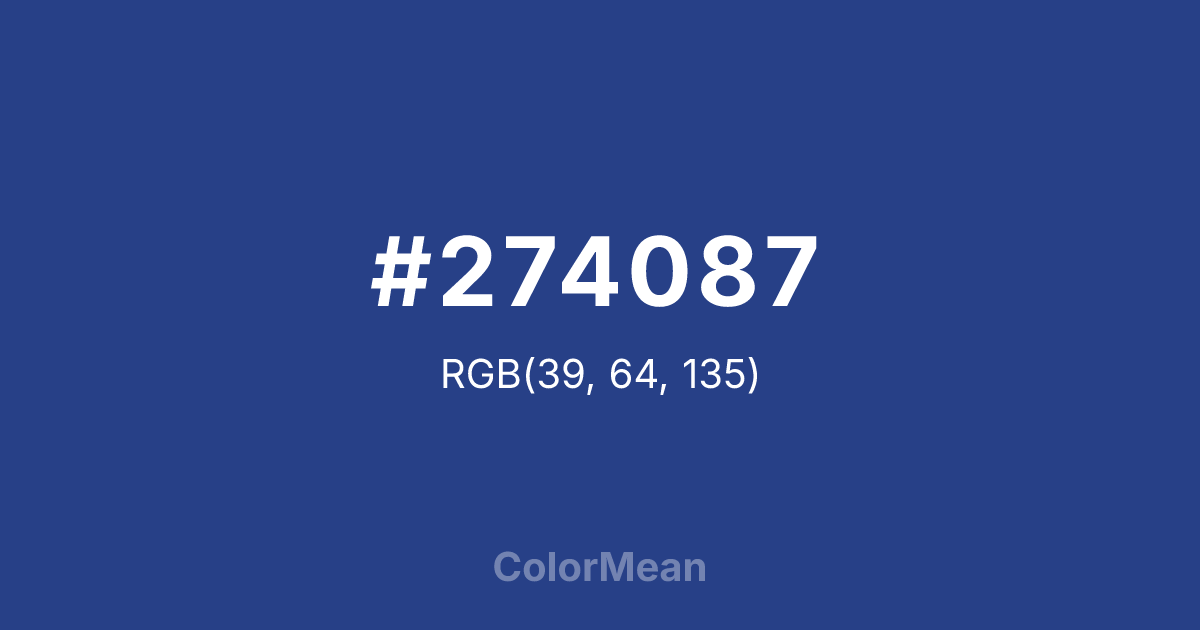 #274087 RGB value is (39, 64, 135). The hex color red value is 39, green is 64, and blue is 135. Its HSL format shows a hue of 224°, saturation of 55 percent, and lightness of 34 percent. The CMYK process values are 71 percent, 53 percent, 0 percent, 47 percent.