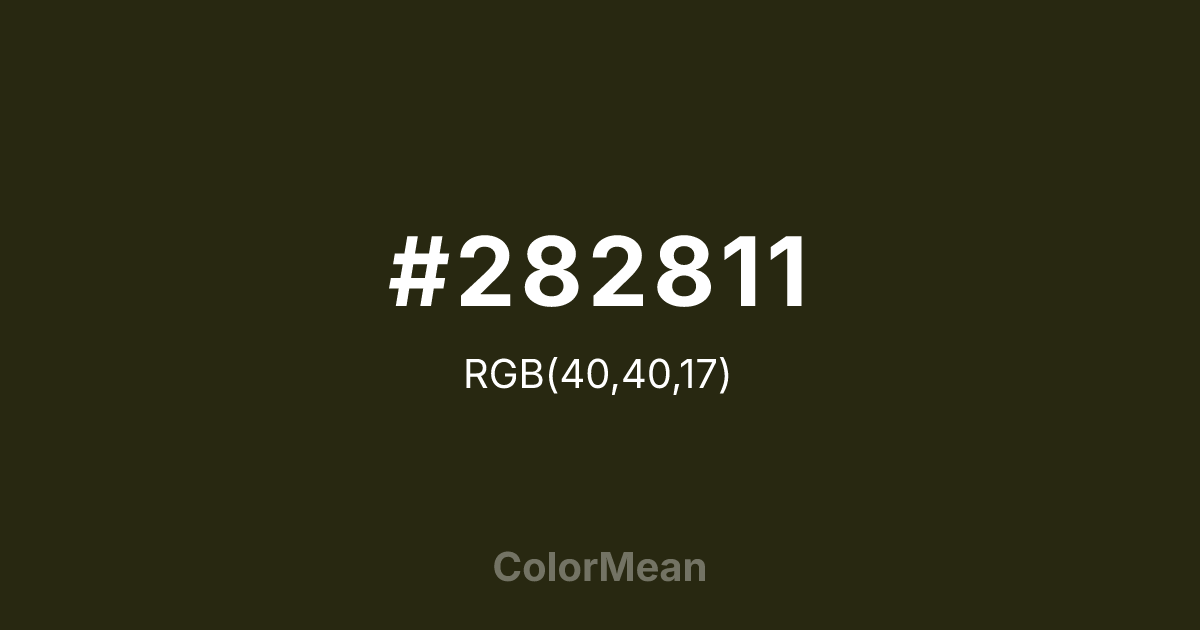 #282811 RGB value is (40, 40, 17). The hex color red value is 40, green is 40, and blue is 17. Its HSL format shows a hue of 60°, saturation of 40 percent, and lightness of 11 percent. The CMYK process values are 0 percent, 0 percent, 58 percent, 84 percent.
