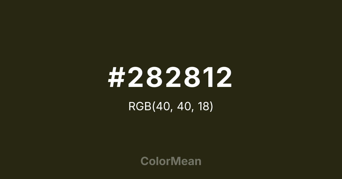 #282812 RGB value is (40, 40, 18). The hex color red value is 40, green is 40, and blue is 18. Its HSL format shows a hue of 60°, saturation of 38 percent, and lightness of 11 percent. The CMYK process values are 0 percent, 0 percent, 55 percent, 84 percent.