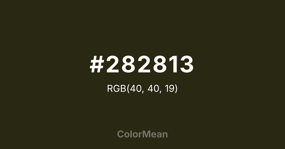#282813 RGB value is (40, 40, 19). The hex color red value is 40, green is 40, and blue is 19. Its HSL format shows a hue of 60°, saturation of 36 percent, and lightness of 12 percent. The CMYK process values are 0 percent, 0 percent, 53 percent, 84 percent.