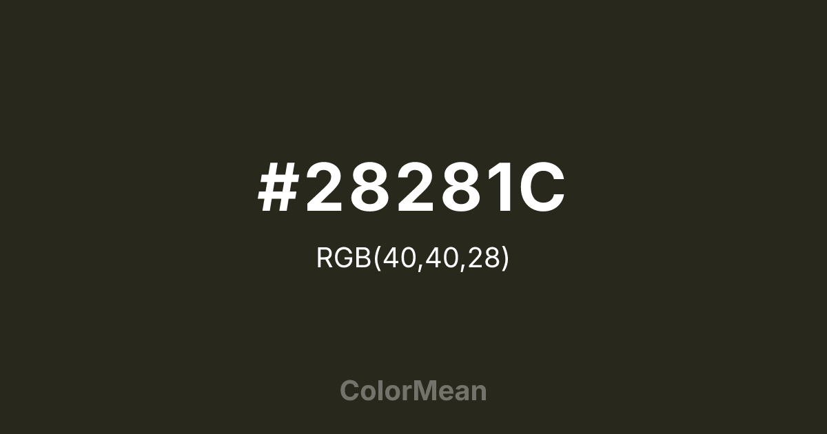 #28281C RGB value is (40, 40, 28). The hex color red value is 40, green is 40, and blue is 28. Its HSL format shows a hue of 60°, saturation of 18 percent, and lightness of 13 percent. The CMYK process values are 0 percent, 0 percent, 30 percent, 84 percent.
