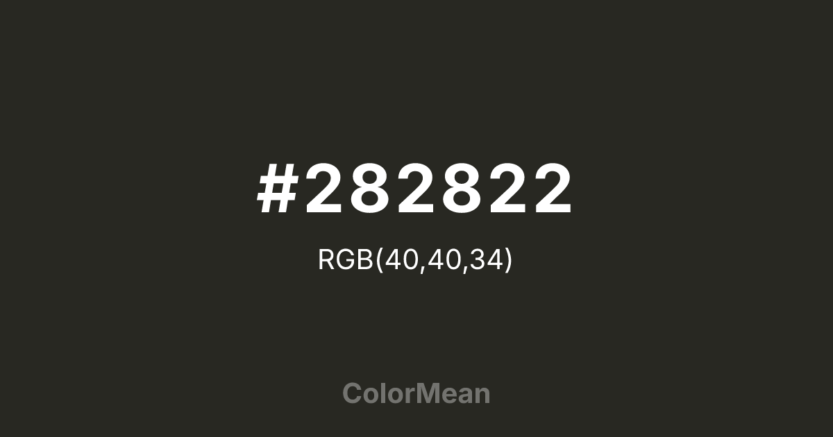 #282822 RGB value is (40, 40, 34). The hex color red value is 40, green is 40, and blue is 34. Its HSL format shows a hue of 60°, saturation of 8 percent, and lightness of 15 percent. The CMYK process values are 0 percent, 0 percent, 15 percent, 84 percent.