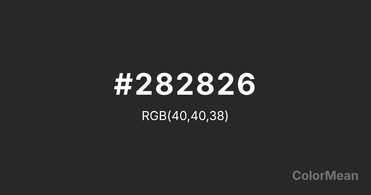 #282826 RGB value is (40, 40, 38). The hex color red value is 40, green is 40, and blue is 38. Its HSL format shows a hue of 60°, saturation of 3 percent, and lightness of 15 percent. The CMYK process values are 0 percent, 0 percent, 5 percent, 84 percent.