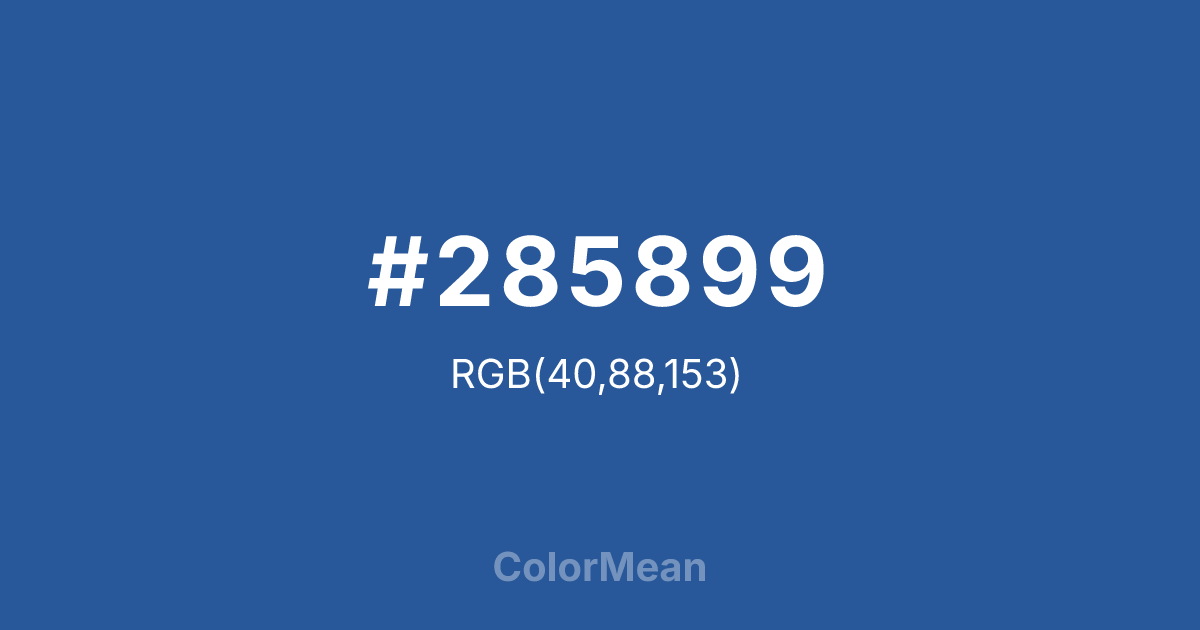 #285899 RGB value is (40, 88, 153). The hex color red value is 40, green is 88, and blue is 153. Its HSL format shows a hue of 215°, saturation of 59 percent, and lightness of 38 percent. The CMYK process values are 74 percent, 42 percent, 0 percent, 40 percent.