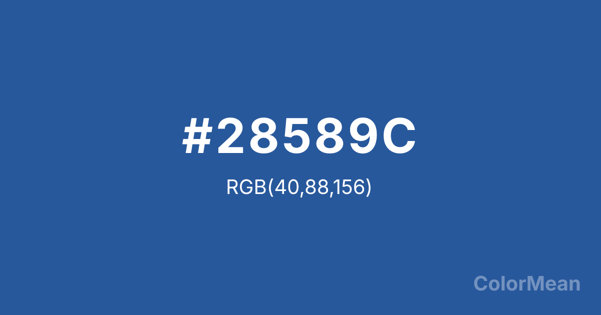 Cyan Cobalt Blue (#28589C) RGB value is (40, 88, 156). The hex color red value is 40, green is 88, and blue is 156. Its HSL format shows a hue of 215°, saturation of 59 percent, and lightness of 38 percent. The CMYK process values are 74 percent, 44 percent, 0 percent, 39 percent.