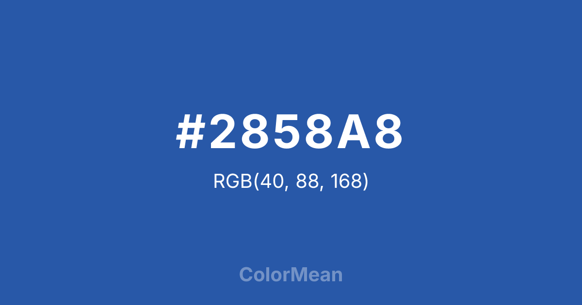 #2858A8 RGB value is (40, 88, 168). The hex color red value is 40, green is 88, and blue is 168. Its HSL format shows a hue of 218°, saturation of 62 percent, and lightness of 41 percent. The CMYK process values are 76 percent, 48 percent, 0 percent, 34 percent.