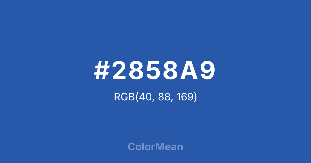 #2858A9 RGB value is (40, 88, 169). The hex color red value is 40, green is 88, and blue is 169. Its HSL format shows a hue of 218°, saturation of 62 percent, and lightness of 41 percent. The CMYK process values are 76 percent, 48 percent, 0 percent, 34 percent.