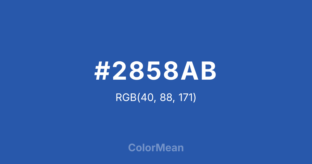 #2858AB RGB value is (40, 88, 171). The hex color red value is 40, green is 88, and blue is 171. Its HSL format shows a hue of 218°, saturation of 62 percent, and lightness of 41 percent. The CMYK process values are 77 percent, 49 percent, 0 percent, 33 percent.