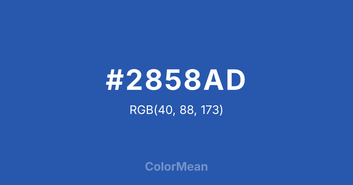 #2858AD RGB value is (40, 88, 173). The hex color red value is 40, green is 88, and blue is 173. Its HSL format shows a hue of 218°, saturation of 62 percent, and lightness of 42 percent. The CMYK process values are 77 percent, 49 percent, 0 percent, 32 percent.