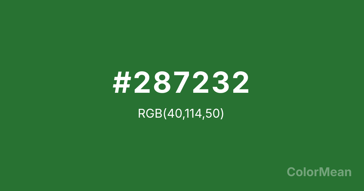#287232 RGB value is (40, 114, 50). The hex color red value is 40, green is 114, and blue is 50. Its HSL format shows a hue of 128°, saturation of 48 percent, and lightness of 30 percent. The CMYK process values are 65 percent, 0 percent, 56 percent, 55 percent.