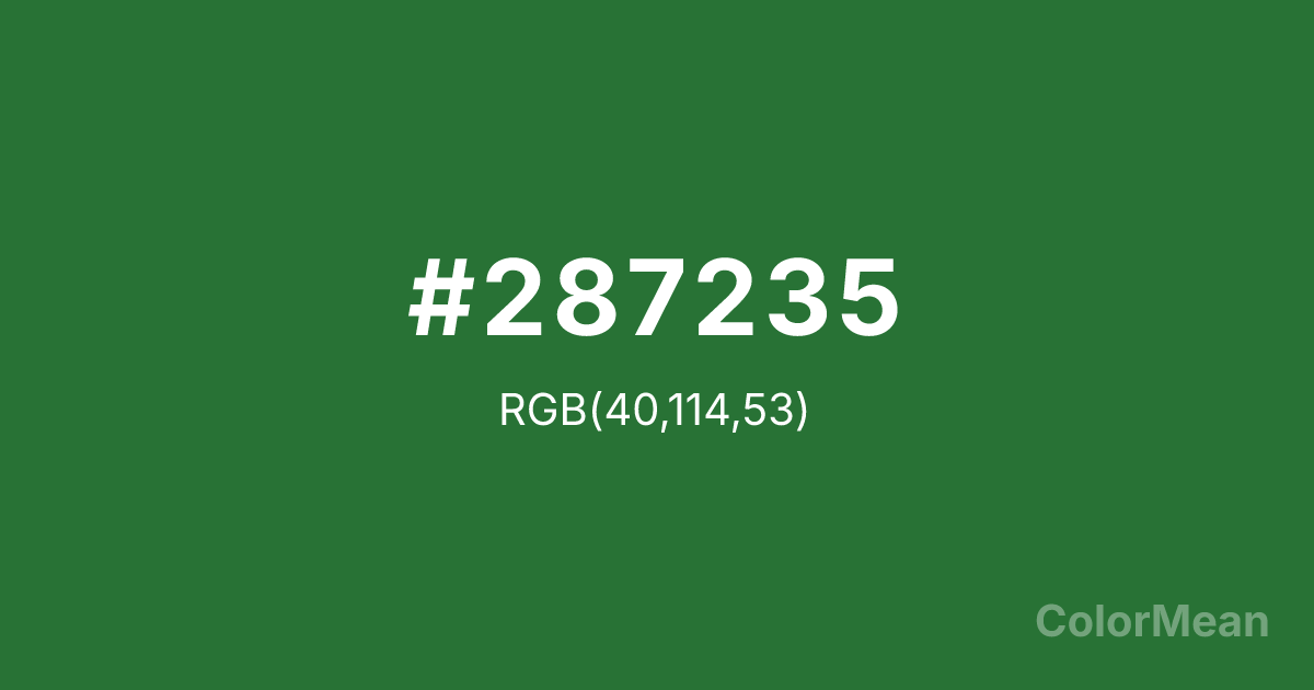 #287235 RGB value is (40, 114, 53). The hex color red value is 40, green is 114, and blue is 53. Its HSL format shows a hue of 131°, saturation of 48 percent, and lightness of 30 percent. The CMYK process values are 65 percent, 0 percent, 54 percent, 55 percent.
