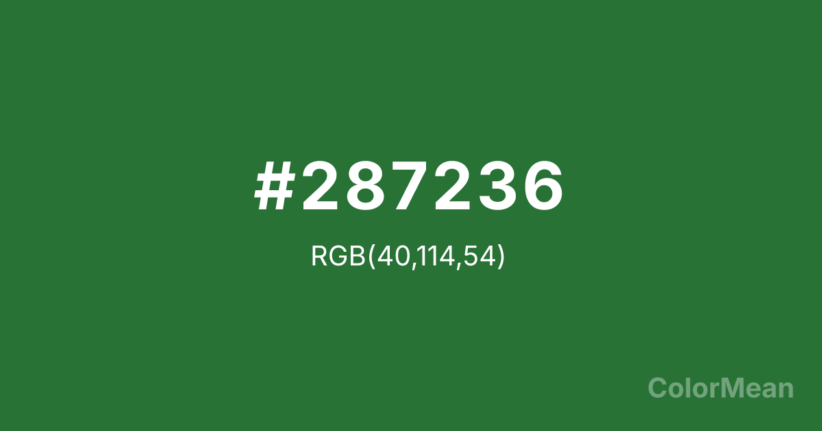 #287236 RGB value is (40, 114, 54). The hex color red value is 40, green is 114, and blue is 54. Its HSL format shows a hue of 131°, saturation of 48 percent, and lightness of 30 percent. The CMYK process values are 65 percent, 0 percent, 53 percent, 55 percent.