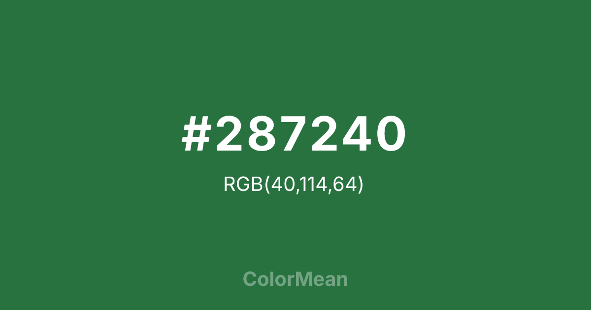 #287240 RGB value is (40, 114, 64). The hex color red value is 40, green is 114, and blue is 64. Its HSL format shows a hue of 139°, saturation of 48 percent, and lightness of 30 percent. The CMYK process values are 65 percent, 0 percent, 44 percent, 55 percent.