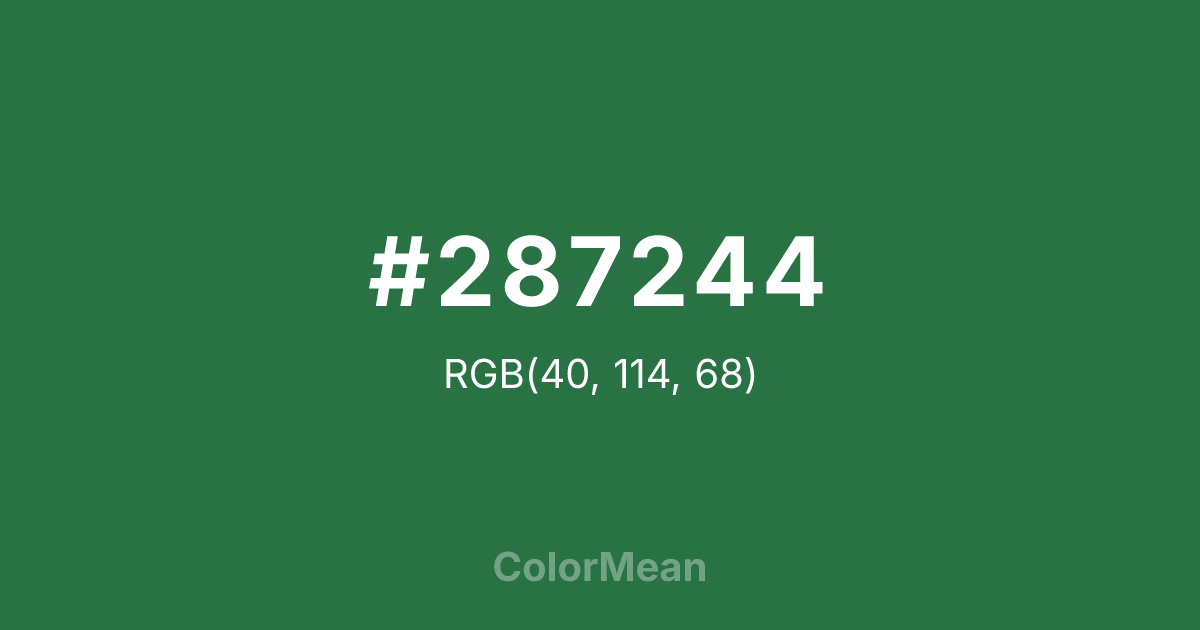 #287244 RGB value is (40, 114, 68). The hex color red value is 40, green is 114, and blue is 68. Its HSL format shows a hue of 143°, saturation of 48 percent, and lightness of 30 percent. The CMYK process values are 65 percent, 0 percent, 40 percent, 55 percent.