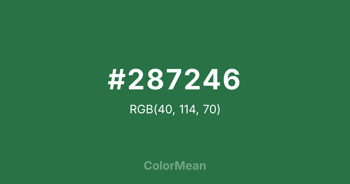 #287246 RGB value is (40, 114, 70). The hex color red value is 40, green is 114, and blue is 70. Its HSL format shows a hue of 144°, saturation of 48 percent, and lightness of 30 percent. The CMYK process values are 65 percent, 0 percent, 39 percent, 55 percent.