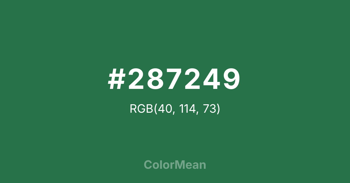 #287249 RGB value is (40, 114, 73). The hex color red value is 40, green is 114, and blue is 73. Its HSL format shows a hue of 147°, saturation of 48 percent, and lightness of 30 percent. The CMYK process values are 65 percent, 0 percent, 36 percent, 55 percent.