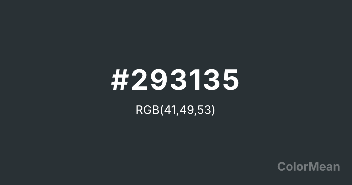 #293135 RGB value is (41, 49, 53). The hex color red value is 41, green is 49, and blue is 53. Its HSL format shows a hue of 200°, saturation of 13 percent, and lightness of 18 percent. The CMYK process values are 23 percent, 8 percent, 0 percent, 79 percent.