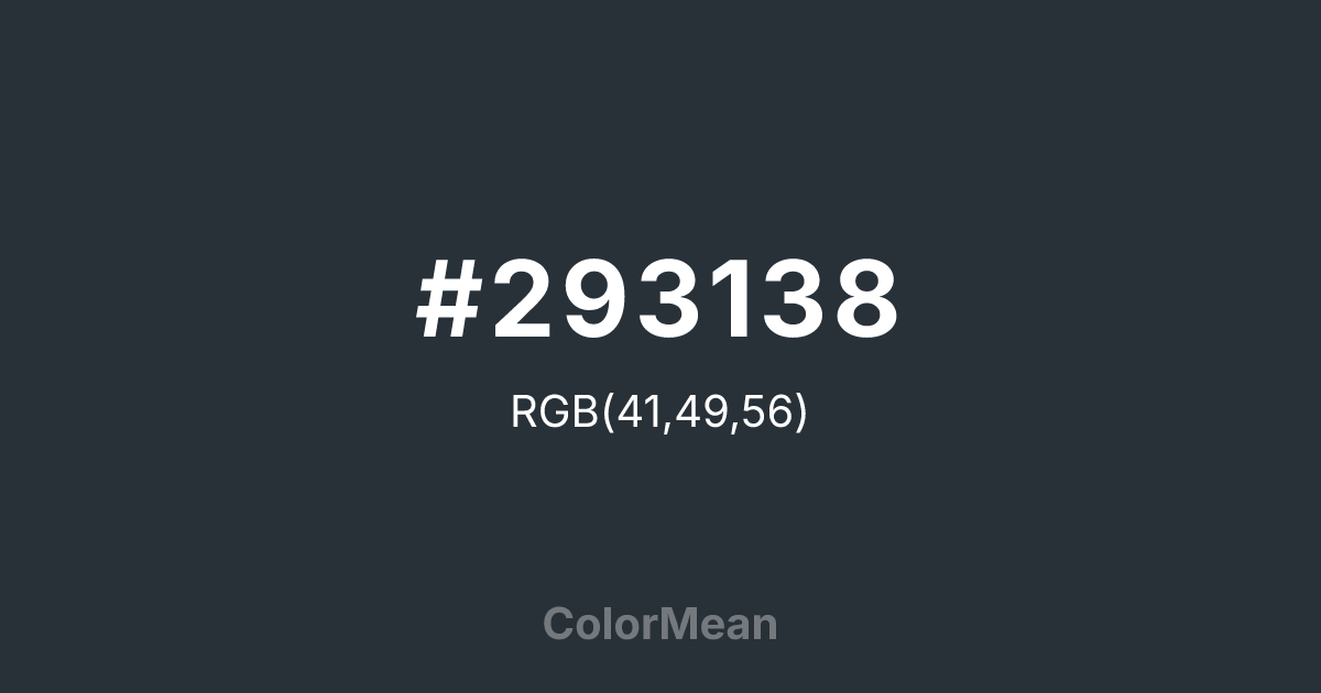 #293138 RGB value is (41, 49, 56). The hex color red value is 41, green is 49, and blue is 56. Its HSL format shows a hue of 208°, saturation of 15 percent, and lightness of 19 percent. The CMYK process values are 27 percent, 13 percent, 0 percent, 78 percent.