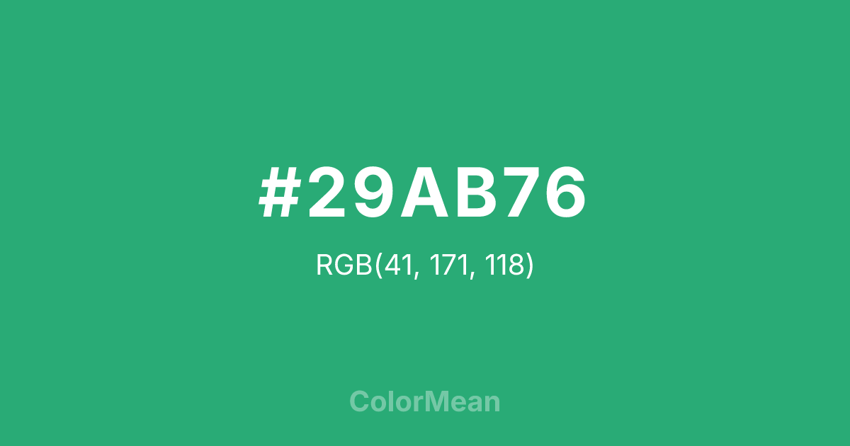 #29AB76 RGB value is (41, 171, 118). The hex color red value is 41, green is 171, and blue is 118. Its HSL format shows a hue of 156°, saturation of 61 percent, and lightness of 42 percent. The CMYK process values are 76 percent, 0 percent, 31 percent, 33 percent.